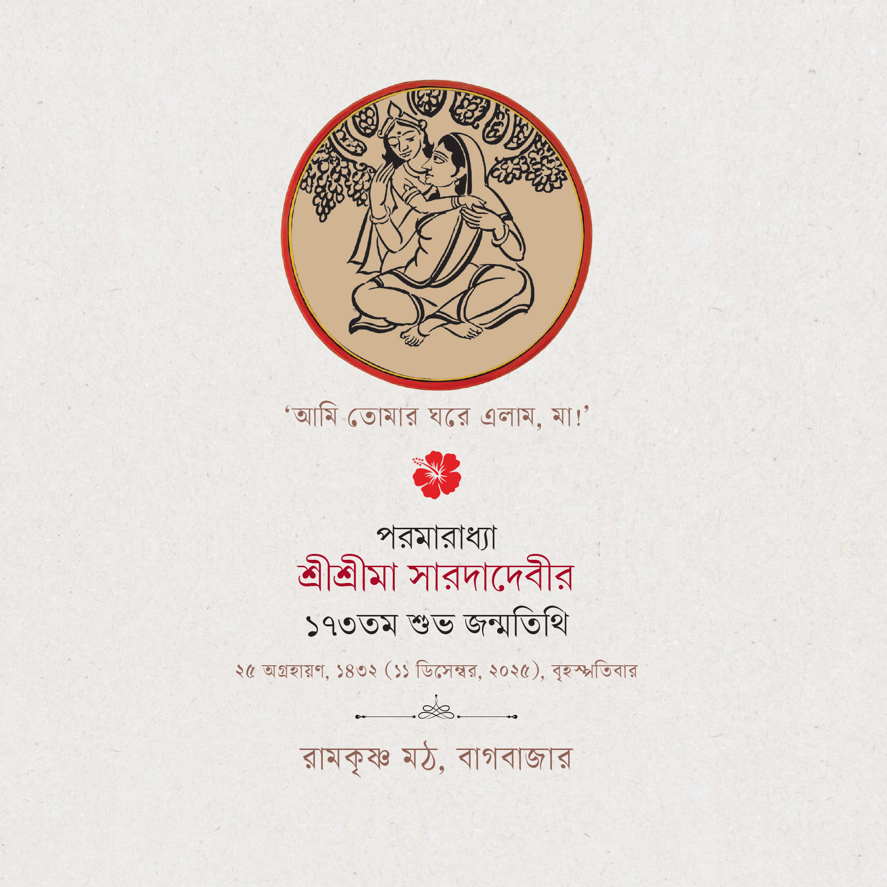 শ্রীমা সারদা এখন ধ্যানলোকে। আমাদের লোকচক্ষুর অন্তরালে। প্রায় একশো তিন বছর (২০২৩ খ্রি.) হলো শ্রীশ্রীমা মর্ত্যধাম ছেড়ে দিব্যধামে চলে গিয়েছেন। এখন একমাত্র ধ্যানের দ্বারাই আমরা তাঁকে মানসপটে জীবন্ত করে তুলতে পারি। আমরা যাঁকে ভালোবাসি তাঁর কথা চিন্তা করি; এই গভীর চিন্তার দ্বারা ধ্যেয়ের সত্তা ভিতরে আসে। শ্রীরামকৃষ্ণ বলেছেন, “যে আমার চিন্তা করবে সে আমার ঐশ্বর্য লাভ করবে, যেমন পিতার ঐশ্বর্য পুত্র লাভ করে। আমার ঐশ্বর্য—জ্ঞান-ভক্তি, বিবেক-বৈরাগ্য, শান্তি-সুখ, ভাব-মহাভাব, প্রেম-সমাধি।”
