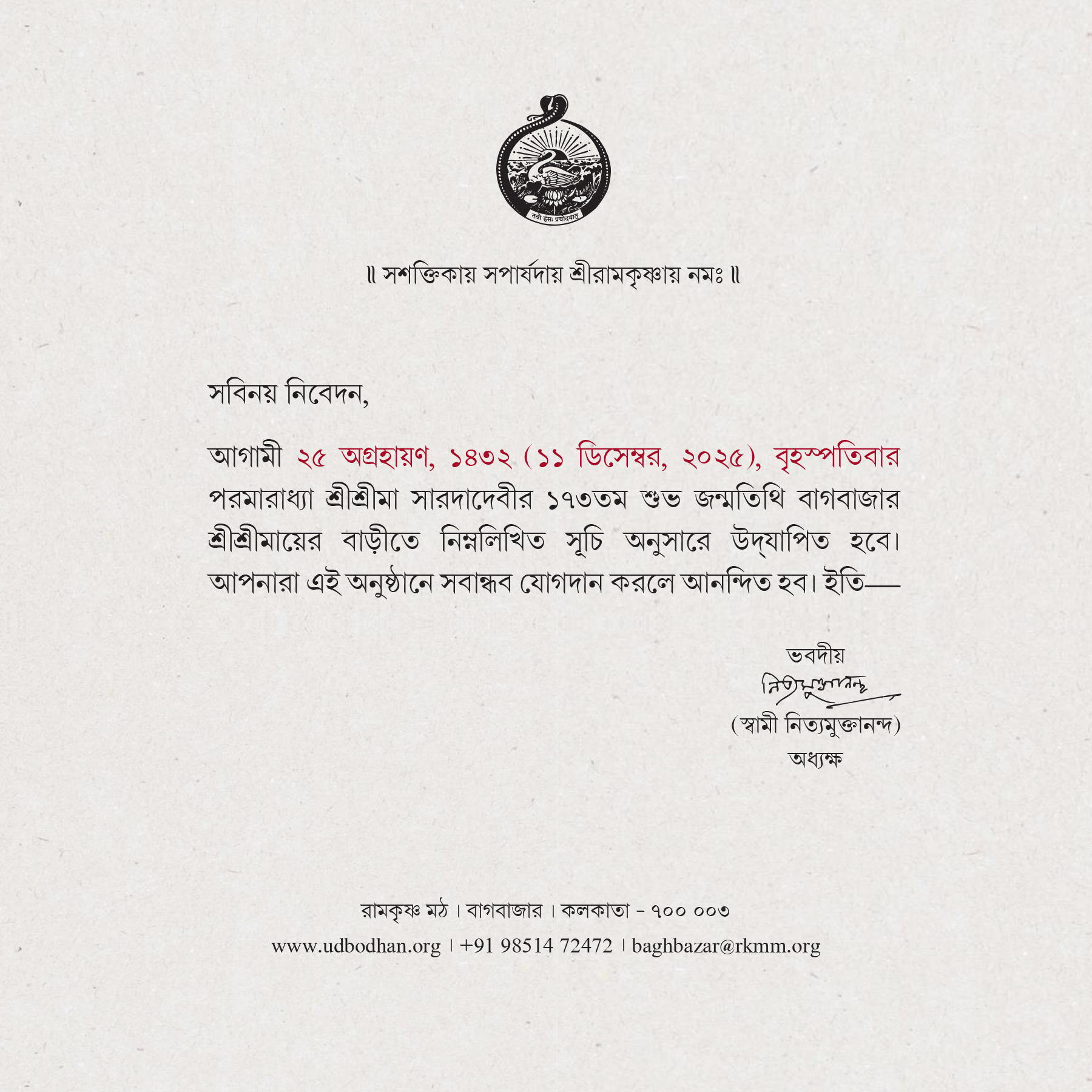 উদ্বোধন পত্রিকার গত অগ্রহায়ণ ১৪৩০ সংখ্যায় উল্লেখ করা হয়েছিল, আগামী ২৫ নভেম্বর থেকে সারদানন্দ হল-এ ‘বাংলার ব্রত ও আলপনা’ বিষয়ে একটি প্রদর্শনী ও কর্মশালা আয়োজিত হবে। অনিবার্য কারণবশত অনুষ্ঠানটি আপাতত স্থগিত থাকছে। এই প্রদর্শনী ও কর্মশালাটি আগামী ফেব্রুয়ারি ২০২৪-এ অনুষ্ঠিত হবে। এই বিষয়ে বিস্তারিত জানতে পাঠকদের উদ্বোধন-এর ওয়েবসাইট এবং সোশ্যাল মিডিয়া পেজে চোখ রাখতে অনুরোধ করা হচ্ছে।